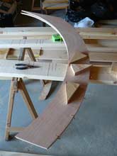 Next the halves were pulled apart and the wedges buttered with Titebond III and driven into place. If you’ve ever tried to hang a multi-hinged door that’s warped enough so that the hinges don’t line up right, you’ll know that the plywood doesn’t want to be forced into this shape. I’m convinced that the “torturing” of the plywood this way actually makes the resulting structure stronger, but it makes for some interesting assembly quirks--like one little wooden wedge being spit out and flung across the room. while you’re trying to get the next one into place. Wear safety glasses and be prepared to duck, and drill some holes in the plywood where the wedges are going to go, for temporary screws or nails to hold them in place while the glue dries. You can just barely see the nails in this photo. |