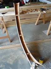 The boat began to take shape as the longitudinals were bent around the mold and fastened to the transom. |