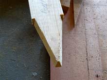 Now I was almost ready for the fun part, as I got to see how all the components fit together to make a boat shape. But first I had to notch the keelson to fit the stem, and the chine logs to fit into the keelson/stem joint. Here’s the keelson notch, made with a jigsaw and a small battery-powered circular trim saw, with a little help from a Japanese pullsaw. |