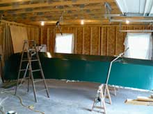 Once again my cleverness nearly killed me. My ingenious solution, designed to turn the hull over and move it back at the same time, wound up being another one of those “don’t try this at home” things. I rigged up a pair of come-alongs with pulleys and braided rope in a similar arrangement to the one I’d used to turn the hull over the first time. But this time, instead of hanging the rigs directly above the parts of the hull being supported, I attached them to the garage joists about three feet in the direction I wanted to move the boat, so that they pulled on a diagonal.