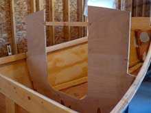 Finally the bulkhead was fitted and installed. Note the holes for deck plates. After this last bulkhead was firmly in place, I felt confident enough that the hull would hold its shape, to remove the mold and wedge a 2x4 in its place to keep the gunwales in position until the washboards were done.