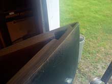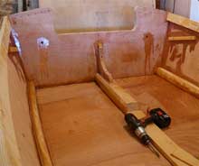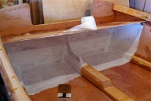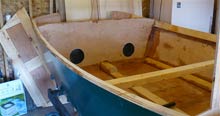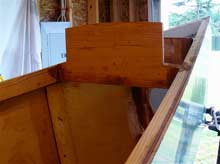 The last bulkhead to be put in was in the stern, forming the front support for the slop shelf and the front wall of the aft floatation chamber. But first the shelf itself was constructed. Drain holes were drilled in the transom and the edge grain sealed with epoxy. Shelf supports were glued and screwed to the side planking.