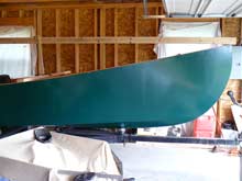 Once the trailer was turned around in the garage, the result of about a hundred 3-point turns, I was ready to start working on the interior fittings--but not before a lengthy pause to admire the shape of this hull, which had turned out despite all my bumbling and the still-protruding excess fiberglass cloth to be very pretty.