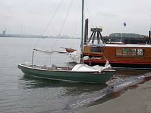 Marine grade fir plywood is used for all structure. The bottom is ½” and the-rest ¼”. All joints are joined with fiberglass tape and epoxy and the exterior is sheathed with fiberglass cloth and epoxy. The benches on each side form the cockpit seats and. berths. Fixed foam flotation under them can provide stability if the boat is filled with water. The space under provides ample stowage. The board is steel plate, with the trunk offset to give better foot room. The inboard rudder swings up and can be removed by pulling a plug from its trunk.