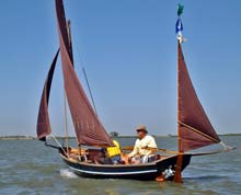 18’ (+/-) sharpie skiff named “Leaps and Bounds” This trip was its first use of the new sail rig. At the helm (right) is guest Roger Allen, curator at the Florida Maritime Museum at Cortez. |