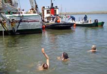 Swim call at Devil’s Isle. San Francisco National Maritime Historical Park museum vessels used for escort and support of the event: L-to-R: Scow Schooner ALMA, tug TELCO, and a garvey skiff. |