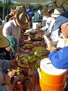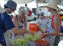 Chow line on the deck of the ALMA. Morning and evening meals were provided there. All Gunkhole participants were assigned to teams to prepare meals and do clean up. Everyone provides and cleans up their own utensils. The system worked smoothly and the food was really good. |