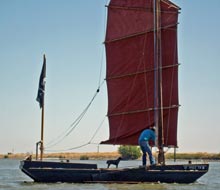 Junk-rigged barge. Virtually everything was home-made, including the lines. He wove his own rope from recycled baling twine. He sewed his own canvas sails and colored them with redwood deck stain. |