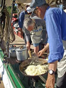 Supper prep crew aboard the ALMA. identified by their uniform-aprons with the screen-printed logo of the ’08 Gunkhole on the front. |