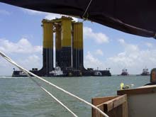 Before we got into the ship channel, we took Kellan aboard and his boat in tow as there is a lot of traffic in this area. Sure enough, we had to overtake this huge oil platform headed out to the gulf. Look at all those tug boats!