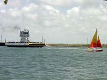 Just before we turned into Lydia Ann Channel, we had to cross the ferry route. These free ferries cross from the mainland to Mustang Island and they carry a lot of traffic. Here Carl and Josh Clover cross behind one of them.