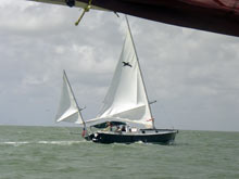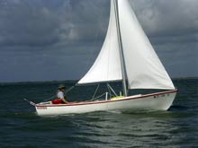 Kellan had left ahead of us so we used full sail to catch him. Once we caught up, we dropped our main and proceeded under our mizzen alone - a surprisingly good match in speed. At that point we were passed by some of the faster boats. Here is Waid Lackey in his Chrysler Lonestar 16, Desiderata.