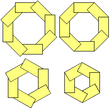 As you can see, these modified versions are regular polygons with a cleaner outside surface than the original birdsmouths. There are two distinct advantages to that. First, the diameter calculations are much simpler. Second, the perfect polygon shape produced would be quite usable as is, and woodturning on a lathe could be avoided.