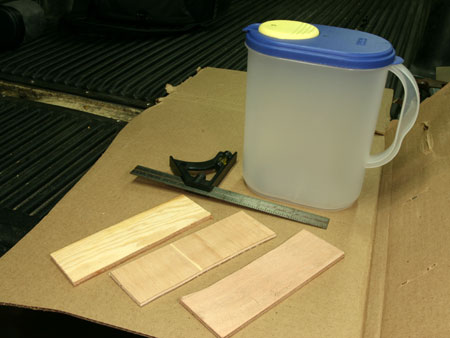 The 3 pieces were approximately 2.5" X 8.5". In figure 1 from left to right they are marine fir, luan underlayment and Okoume. I decided to submerge the pieces for 24 hours in a plastic container completely filled with water. I did leave the spout popped open so the container was not airtight. See figure 2.