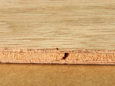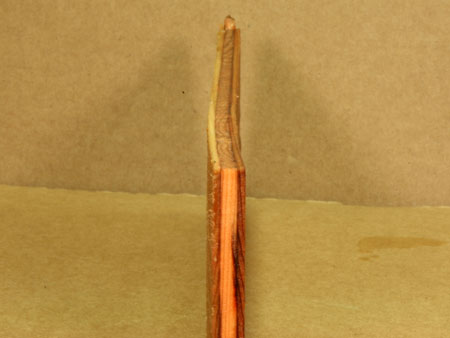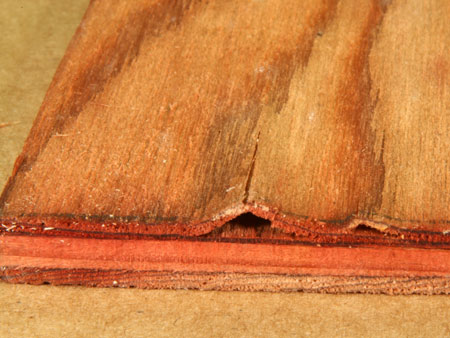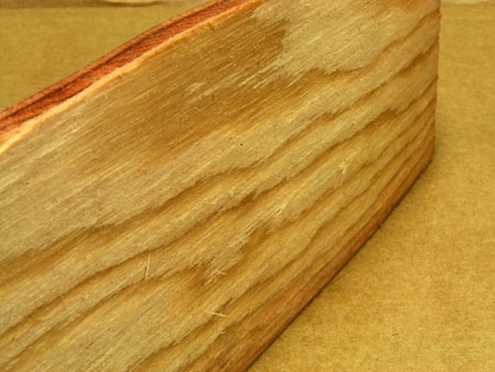 When I removed the pot's lid the following day, I was surprised to see all 3 pieces at the bottom of the pot. They were completely waterlogged. The Marine fir was looking quite bad at this point. The ply separations had become horrible. See figure 6. The grain of the wood was raised very high. See figure 7. The grain of the luan underlayment and Okoume was not raised and neither was warped.