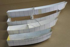 But looking daily at the 14ft model hanging in my kitchen on a string after I have had a few hundred breakfasts, it too may take on a sag in the side panels. I would only have to make the layout panels a couple of inches wider, and I could add some nice curve to the lines. I would just need a longer lofting batten, and not have to worry so much about getting the scarffed edges of the plywood to line up. I could be off an inch and still be able to cut out curved panels.