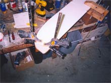 Step 5. Paste wax one side of the damaged board taking care not to get wax in the jagged damaged area. The paste wax will serve as a parting agent in the event any resin seeps out of the half mold. Clamp your half mold to the damaged tip (see Figure 2.) Mix up a batch of epoxy resin thickened to about peanut butter consistency and over fill the half mold with the thickened epoxy. (See Figure 3.) Let cure in a warm environment.
