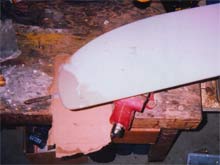 Step 2. Place the board on its side with the smooth side up and coat the plastic wrapped area with a generous coat of unthickened epoxy resin. Be careful not to get any resin on the bare board as it will adhere. Immediately cover with a layer of fiberglass cloth (drape the excess cloth over the tip) and wet out the cloth with more resin. Let the resin cure in a warm environment.