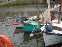 | Some of the 'sprits housed by sliding back inboard, but many more were designed to fold up alongside the mast. The green boat here shows a popular configuration. |