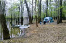 | Camp along the Neches. The high-water mark from the last flood is clearly visible. |