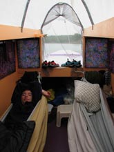We spent some time cobbling together the camping top. We brought four PVC hoops preshaped to fit the aisle, then added polytarp over and bug net draped at the ends. How wonderful to be able to walk upright in the cabin.