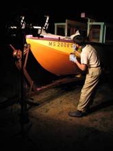 The registration numbers were painted on the bow the night before launch, and we cleaned up the drips from overnight dew the next morning.