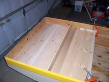 I kept the self-draining forward deck and motor well. It was framed with lumberyard boards, with the sides and bulkheads made from ¼ inch plywood, and the bottom made from 3/8’s. This resulted in a flimsy bottom, but the solution was fortuitous; longitudinal runners on the bottom, along with 2x2 framing on the inside gave me the rigidity I needed, and the bright-finished douglas fir runners look beautiful.