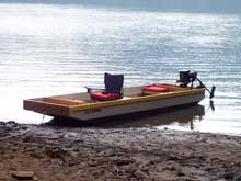 First of all, this is not the Conestoga found in my plans. The basic idea is there, but with a number of changes. First of all, the beam is four feet, not five feet, and sleep-aboard capability was eliminated. Using a width the same as that of a sheet of plywood made the design much simpler. Also, I went with a more conventional powerplant. It moves along nicely with either my Minnkota 40lb. thrust tolling motor, or my 5HP Briggs and Stratton outboard. There should be room, however, if I ever want to try the gasoline-electric drive I proposed in the contest. In place of the foot well I placed in the sleeping cabin, I put a locker.