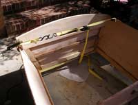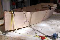| The transom is added. We found that the racheting tie down straps available inexpensively at boat and hardware stores make an excellent and easy to use Spanish windlass. Here it holds the transom in place for a trial fitting. |