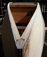 The framing and gusset supports for the bow and stern seating/decks are installed, using scrap timber to extend the reach of the clamps. I was worried that the 1x1 framing (red cedar) seemed a little on the light side, but so far it has seem plenty strong enough in practice. Note how the triangular shaped ply gussets are used where two frames intersect. |