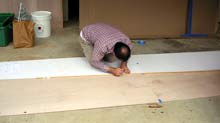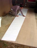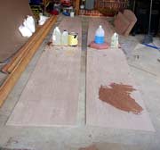 The bottom panel was roughly laid out and then placed on the bottom for final measuring, and then cut oversize. Here weights hold the butt straps in place while the epoxy sets. There’s a gap in the straps along the centerline where the centerboard case will go, and along the panel edges to allow for the chine logs. |