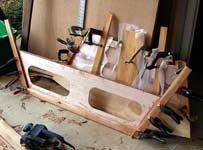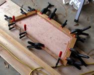 Framing is cut and sized for the centerboard case. Storer does not recommend fiberglassing the inside section of the case, but does recommend three coats of epoxy, allowing each coat to begin to harden before applying the next one. The coating was actually done in the next session and we also added graphite powder to the last coat, to increase abrasion resistance. The case was clamped together after the third coat was applied. |