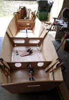 Olivier cuts an access hole, which will be covered with a deckplate, that will allow access to the watertight storage under the stern seat. The framing has been attached, but not notched for the chine, which proved to be a moderately fussy job. About this time, Olivier got a Japanese pull saw, which made such fine work easier. Also, designer Storer does not give the bevel angles for the framing; instead he specifies an overlap distance which is planed to make the correct bevel. This worked okay, but I have a personal preference for having the angles which then can be precut into the framing with a circular saw. |