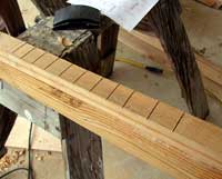 Rip cedar into proper size pieces for the chines and the bulkhead framing. Measure, cut and glue most of the bulkhead and transom framing, allowing overlaps of the framing for beveling. Glue on the internal chine. Time: about 5 hours.