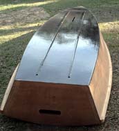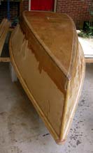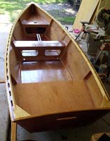| The finished hull is a medley of varnished woods; show here on launching day at Lake Hall in Tallahassee, FL. |