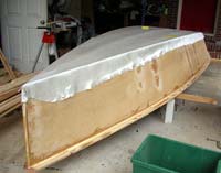 Storer recommends to save weight by only applying fiberglass tape at the chines; there are too many oyster bars where we are for that, so we elected to cover the entire bottom with cloth, with an additional layer of tape at the chines. Here the cloth is draped over the hull, ready for the epoxy. |