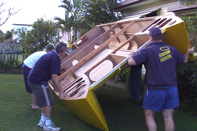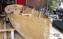 | Construction of the basic hull is complete, and Olivier is sealing the inside and hull with the recommended three coats of epoxy. |