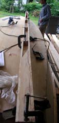 | The first layer of the gunwales is clamped and glued in place. Also visible are the clamps on the upper frame arms that are installed after the sides and bottom are assembled. There are two outside layers to the gunwales and then on the inside of the boat spacers and another inwale, making the upper edge of the hull stiff and strong. |