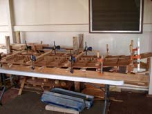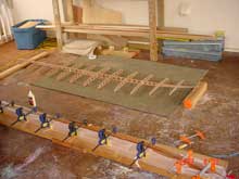 The rocker table is then modified to match the frame’s rocker by building up the crossmembers at each station to match the stringer. The idea is to have perfect contact with each transverse frame. Once this is complete the bottom panel is laid down and the frame placed on top of it. Once it is marked to ensure that it is centered, the frame can be glued up with titebond, set on the bottom panel and clamped to the rocker table.