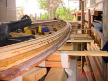 Stripping the rails is a simple procedure. A single square redwood strip is first set in notches cut into the bottom edge of each frame to make a proper chine. Then strips of ¼” fir are glued into place. This requires the use of many clamps. The strips can be routed bead-and-cove style for an easy fit; mine were plain square stock which required a bit of beveling with a small plane in order to get a good fit. The strips follow the contour of the frame until they are nearly horizontal, and the topmost strips are planed and sanded to blend into the frame. This will provide a solid glue joint when the deck is joined.
