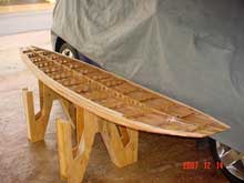 A hollow wooden surfboard is composed of an interior frame made up of a longitudinal stringer and transverse frames every 8 inches or so. I bought my frame pre-made from the good folks at Grain Surfboards in Maine, although it is easy enough to make one, particularly if you have a surfboard to take measurements from. The frame is made of marine ply, and most builders will likely have enough stock in the scrap bin to make it. The stringer is first lofted with the appropriate amount of nose and tail rocker and cut out. If necessary, more than one piece can be used with butt or scarph joints. The transverse frames are a little harder to make, since most modern boards have a bottom contour that goes from slightly concave in the nose to flat in the middle and a little vee in the tail. The frames and stringer are notched and joined with epoxy or titebond.