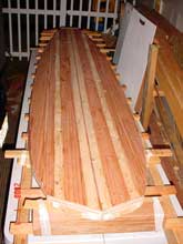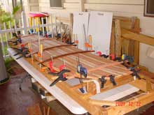 For the bottom, I used closet-liner cedar, cutting scarph joints on my table saw with a home-made jig. The wood itself was beautiful; my scarph joints were not. I used redwood and fir for contrast between the cedar planks. For the deck, I ripped long, clear lengths of fir and redwood. Once the strips are all cut, they are glued together on the rocker table to make a single sheet large enough to fit over the frame with some overlap.