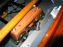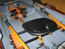 This is the inside of the boat showing the tracks for the seat (the oars have bronze tubes as counterweights - an idea I got from you). People laugh at my tractor seat, but it is really comfortable even after 5 hours of rowing. |