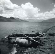 I was looking for something else this morning, and stumbled across the photo of the Yak S-O-F boat and figured some folks would get a kick out of it and scanned it in. It was taken in Tibet in 1995 and the lake is called Namtso or "Heaven Lake", the highest salt water lake in the world at about 15,500 feet (4,700 meters). No idea what the boat was used for -- no other people around for miles, though there are fish in the lake and a couple of islands that pilgrims go to. Interesting boat I thought -- the wood, as you can see from the photos, was hauled up from lower altitudes. Yak skin covering and lacing to hold it all together, I would guess yak fat to protect the skin, and quite a bit of tumblehome.