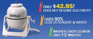 We have compact, inexpensive washing machines and spin dryers that have been extremely popular with boaters. The washers weigh less than 6 pounds, and are only 12” x 12” x 16.” It washes a 5 lb. load clean in only 1-2 minutes, and uses even less water than hand washing.