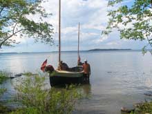 I did go sailing last Wednesday. I wanted a light wind day and boy, did I get it. Most of the time it was dead calm. I did manage to sail across the Channel, about a mile. It was mostly ghosting, with just a few gusts to make it interesting. I had to resort to oars a few times as there is quite a current here and I wanted to avoid being swept too far away with out wind to get back. I waited to write as I was hoping to get some photos of her under sail, but, that didn't work out so here is one of the launch day row.