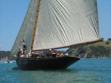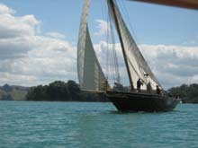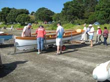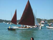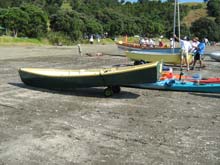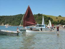 The long white boat is a Mahurangi punt Unique to the area Windfola inthe backgound getting ready to race.