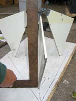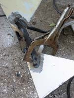 We need some braces between these flukes. Looks like about 5” plus welding tabs bent to 30-degree angles. I used ¾” x 3/16” steel strap, and used a cardboard template to guide the bending. A big vice is terribly handy here.