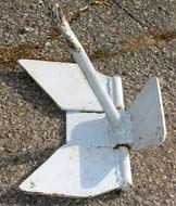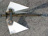 Now that I’ve blithely dragged you through a bunch of welding, let’s look at something the non-welders can do. The ancient Chinese had a pretty cool wooden anchor, and Craig O’Donnell’s “Cheap Pages” has preserved the information for us from a really old issue of The Rudder. Basically this anchor is a wooden shaft with a wooden crosspiece lashed to it. A heavy metal fluke is attached to it, and we can count on the fluke ending up pointing downward. It is trying to sink and the wood is trying to float. Clever of them to figure out how to get away with only one fluke!