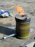 Here’s the spongy, oxidized stuff I took off the top. You don’t want to put this on concrete, because the water in it can cause explosions. This is asphalt, so it just melts and burns. I should have had my ingot mold handy.